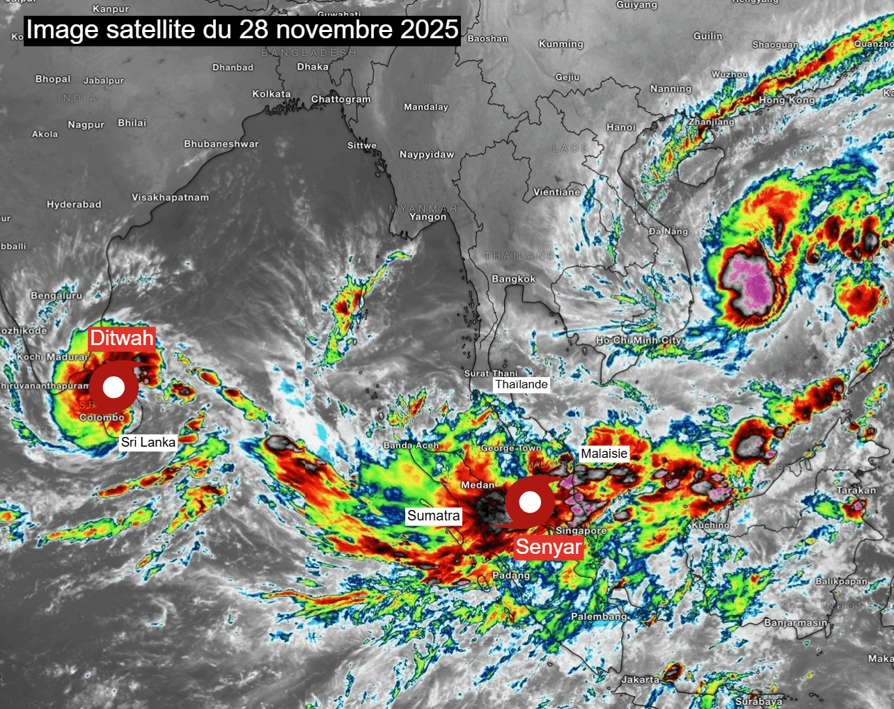 Image satellite montrant Ditwah et Senyar en Asie du Sud-Est le 28 novembre 2025 - Meteosat
