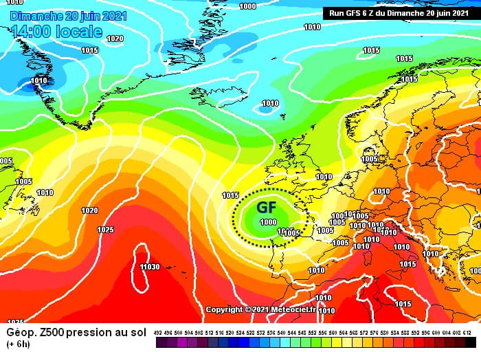 Situation au dimanche 20 juin 2021 montrant la goutte froide sur le proche-Atlantique - via meteociel.fr