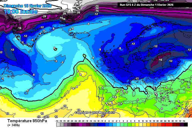 Les scénarios très froids après le 10 février sont de plus en plus fréquents - comme ici, selon le modèle météo américain (mais aussi européen) de dimanche 1er février 00hTU pour le dimanche 15 février 2026.