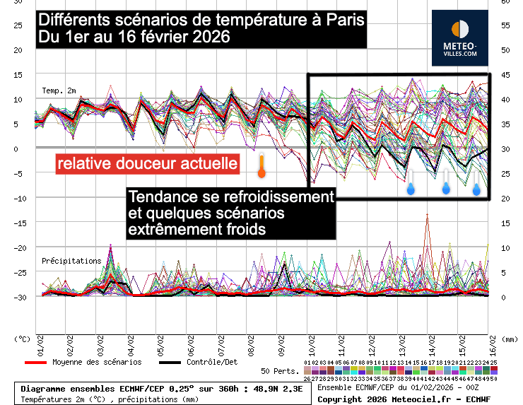 À partir du 9 février, la moyenne générale des scénarios indique une baisse des températures.  Cela ne signifie pas nécessairement que nous aurons un coup de froid, car les prévisions de ces derniers jours ont montré que ce refroidissement a été repoussé de jour en jour.  Néanmoins, la probabilité que l’air froid bascule sur nos régions est plus forte que l’inverse. Certains scénarios sont même extrêmement froids, et tout reste possible. À Paris, certaines prévisions indiquent des températures en dessous de 0° l’après-midi et jusqu’à -5 à -10°C le matin. Ces simulations ne sont pas si isolées que cela et reviennent régulièrement depuis quelques jours.