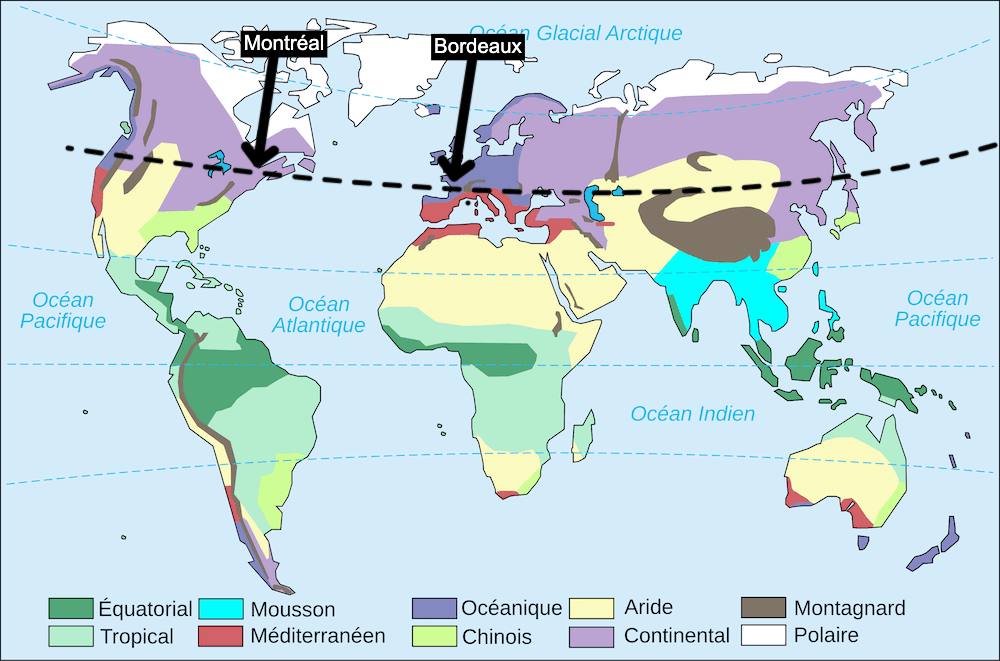 Ainsi, c'est pour cela que les chutes de neige peuvent se produire dès le mois de novembre du côté de Montréal alors que celles-ci ne sont quasiment pas envisageables en cette période du côté de Bordeaux.