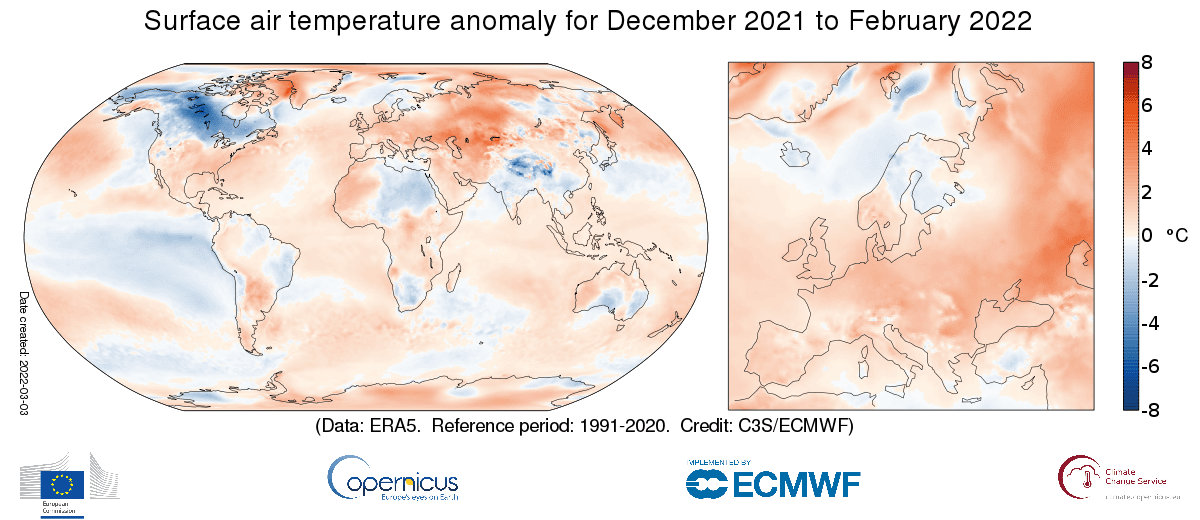 Anomalie de température de la masse d'air - période de décembre 2021 à février 2022 - ECMWF / Copernicus