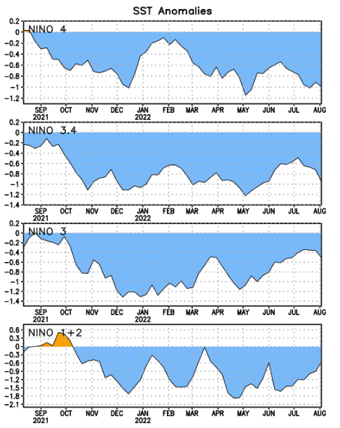 Pour une circulation de type « La Niña », les températures de surface sur cette portion de l'océan Pacifique doivent être plus fraîches que la normale (au minimum -0.5°C d'anomalie sur trois mois consécutifs). Les conditions observées sont conformes à un phénomène La Niña : débuté courant août/septembre 2020, l'anomalie reste bien négative à l'heure actuelle sur les 4 zones de mesure (voir ci-dessous), en moyenne autour de -0.9°C sur la période mai-juin-juillet 2022.