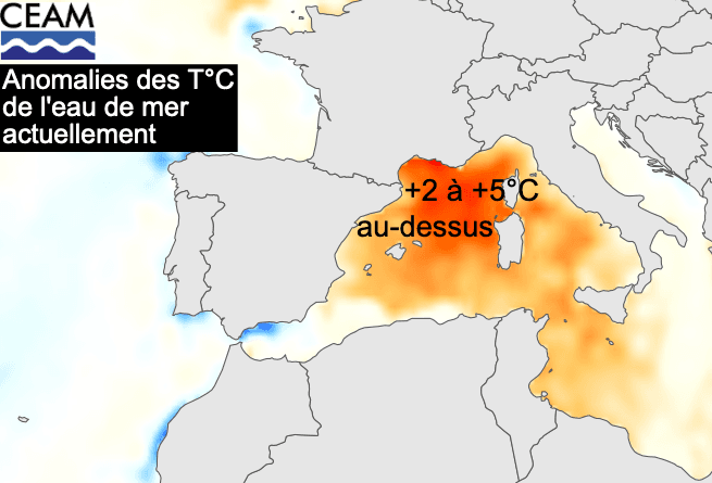 Tout comme pour les températures, la prévision sèche sur le sud du pays n'est qu'une tendance globale étalée sur 3 mois. Elle peut alors cacher certains évènement brefs plus humides qu'il est impossible de prévoir à l'heure actuelle. Toutefois, nous mettons d'ores et déjà en avant un fait à surveiller étroitement dans le quart Sud-Est : la température de la Méditerranée se montre toujours excessivement chaude en cette fin août, avec une anomalie située entre +2 et +5°C. Après cet été particulièrement chaud, la température de l'eau en surface est comprise entre 27 et 29°C sur la Côte d'Azur, en Corse, le long des côtes Italiennes mais également le long de la Catalogne.