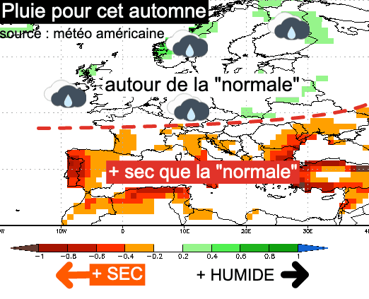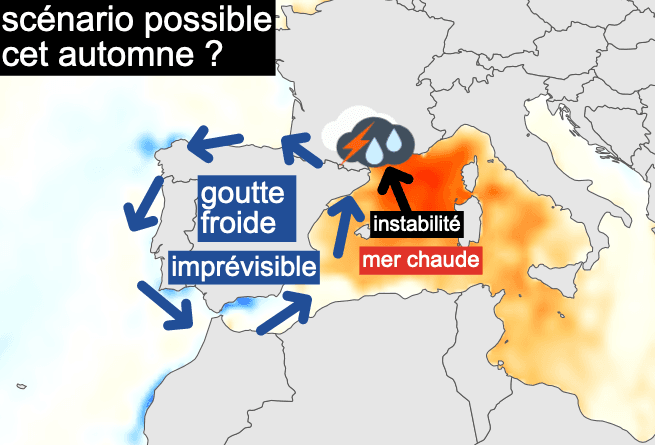 Mais la période automnale marque également le retour des phénomènes pluvieux Méditerranéens. Ceci s'explique par l'isolement de gouttes froides aux abords de la Péninsule Ibérique, qu'il est impossible à prévoir avec autant d'avance. Si la tendance globale est plus sèche que la normale, la température très élevée de l'eau pourrait augmenter l'instabilité de la masse d'air et aggraver l'intensité d'un éventuel épisode orageux Méditerranéen entre Languedoc, Provence et Corse si l'une de ses gouttes froides devait approcher nos régions... à l'instar des évènements des 17 et surtout 18 août sur la Corse (>>).