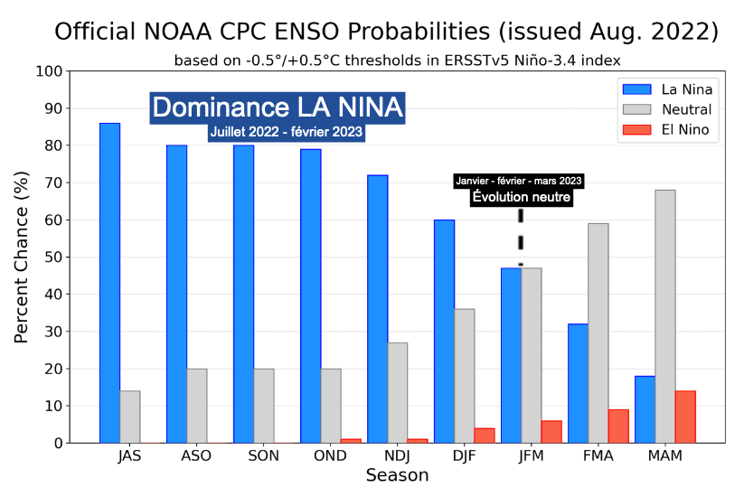 Alors que la température de l'océan Pacifique Équatorial reste bien fraîche, la prévision probabiliste pour ces prochains mois laisse entrevoir une poursuite de cette séquence « La Niña » au cours de la fin d'année 2022, et même jusqu'au début de l'année 2023. Pour la prochaine saison à venir (septembre - octobre - novembre), les chances d'une poursuite du phénomène sont estimées à environ 80%. Ceci diminue pour début 2023 (60% pour la période décembre-janvier-février) avant la fin possible de l'évènement au printemps 2023 (prévision "neutre" majoritaire).