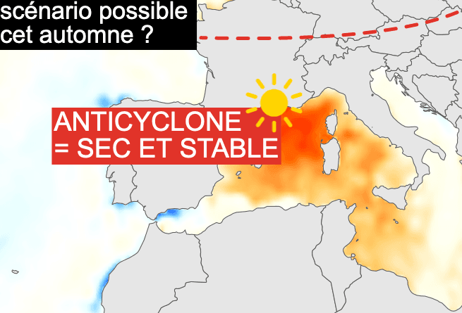 Deux scénarios pourrons alors se mettre en place ces prochains mois. Le scénario majoritaire devrait être la présence de conditions assez anticycloniques (anticyclone des Açores) qui devrait apporter un temps sec, stable et généralement ensoleillée sur les régions septentrionales et notamment près de la Méditerranée.