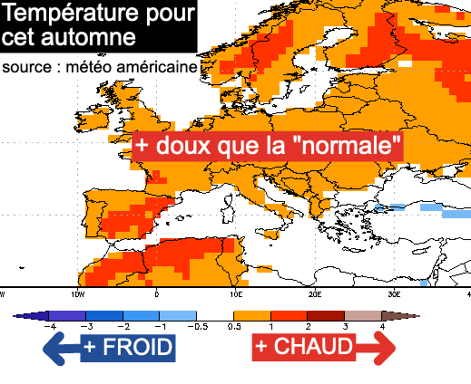 Et dans la lignée d'un été déjà excessivement chaud, l'automne prochain devrait lui même se démarquer par une anomalie douce sur la totalité du continent. Sur la France comme la plupart des pays Européen, les tendances sont dans le rouge avec environ +0.5°C à +1°C d'anomalie thermique (d'après les analyses de la NOAA - Agence américaine d'observation océanique et atmosphérique).