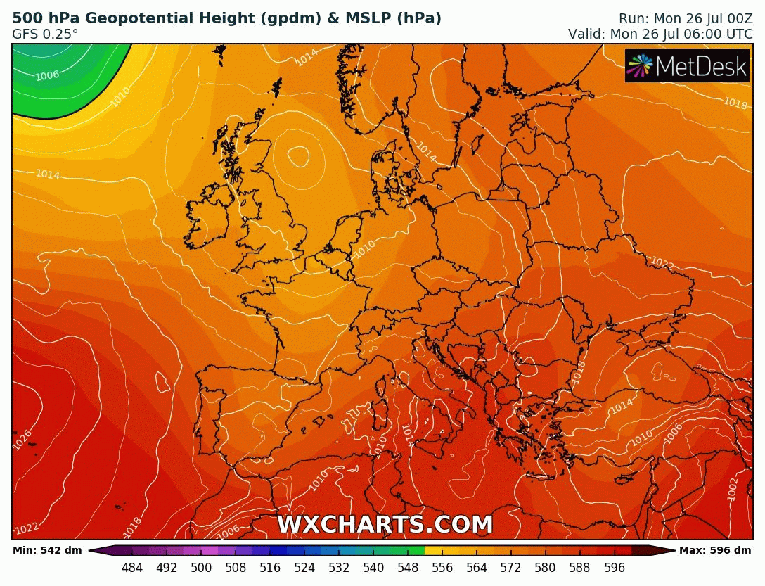 Animation des géopotentiels sur l'Ouest de l'Europe entre le lundi 26 juillet et le dimanche 1er août 2021 – Modèle GFS via WX CHARTS