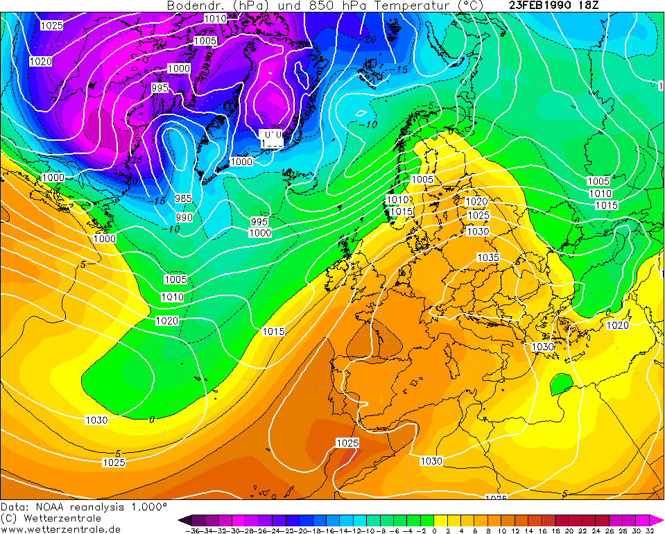 Réanalyse des masses d'air en altitude le 23 février 1990 - site Wetterzentrale.de
