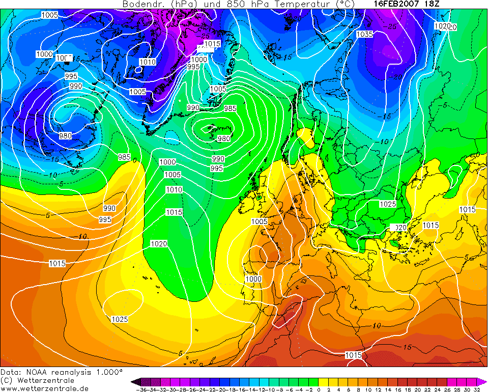 Réanalyse des masses d'air en altitude le 16 février 2007 - site Wetterzentrale.de