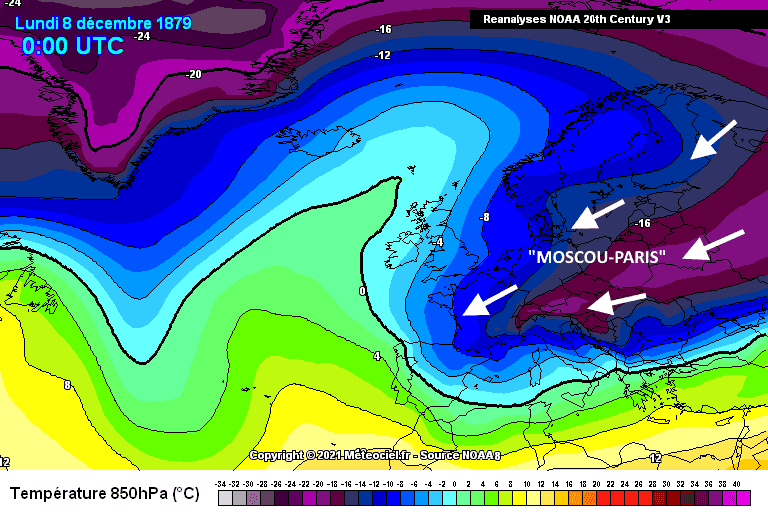 Température de la masse d'air à 850 hPa (vers 1500m) le 8 décembre 1879 - réanalyse via meteociel.fr