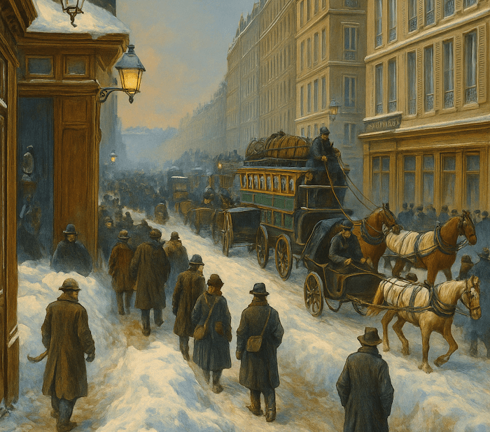 Paris sous environ 40 cm de neige en décembre 1879 - illustration par intelligence artificielle
