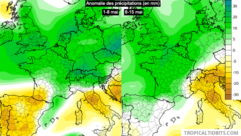 Anomalie des précipitations (en mm) du 1 au 8 mai et du 8 au 15 mai - modèle CFS via TropicalTidbits