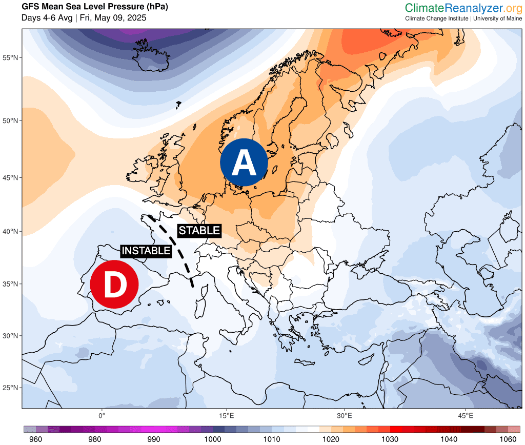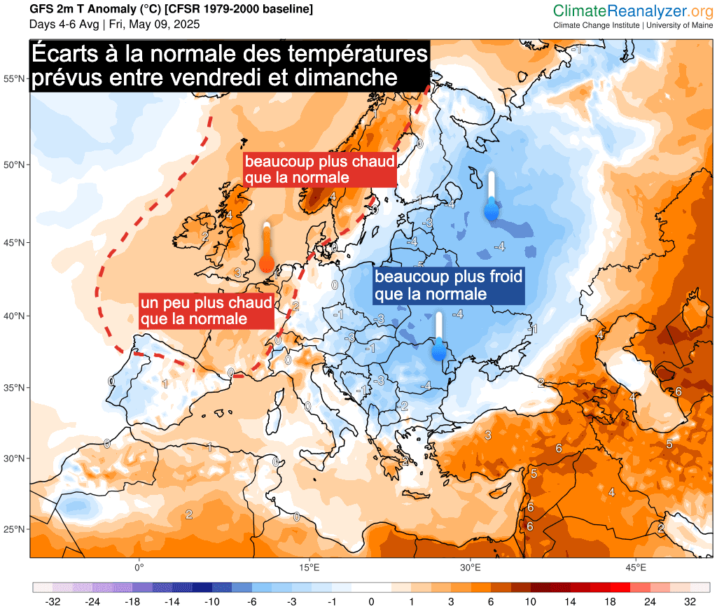 Durant ces quatre jours, la France sera située entre une influence anticyclonique (sur les Pays scandinaves) et une influence dépressionnaire (sur la Péninsule Ibérique).