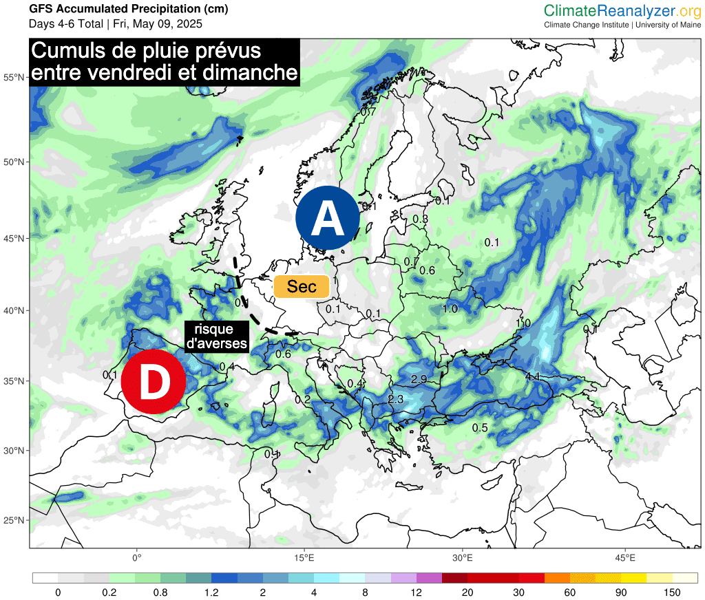 Entre vendredi et dimanche, le risque de précipitations concernera donc essentiellement les régions de l’Ouest et du Sud, alors qu'il ne devrait pas pleuvoir au nord de la Seine (région déjà concernée par un déficit pluviométrique depuis le mois de février).