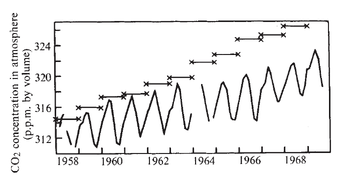 Courbe éditée dans les années 1970 de l'augmentation de la concentration en CO2 dans l'atmosphère