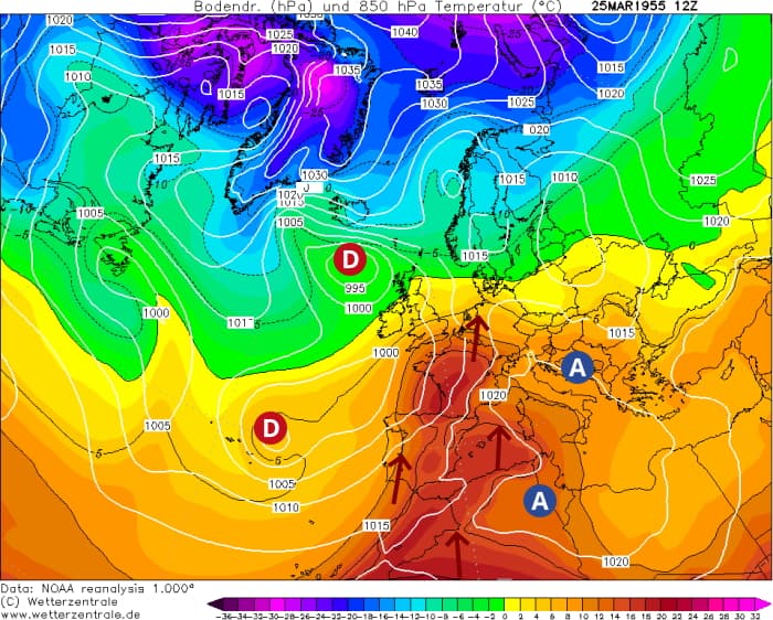 La fin du mois de mars 1955 est marquée par l'un des épisodes de chaleur précoce les plus impressionnants de l'histoire moderne du pays ! Un flux de sud remarquable s'installe entre le Sahara et la France, advectant des masses d'air exceptionnellement chaudes. Il fait jusqu'à 18°C à 850 hPa (vers 1500m) le 25 mars 1955, des masses d'air que l'on rencontre plutôt lors des pics de chaleur estivaux ! Au sol, les températures s'envolent vers des niveaux encore jamais vus si tôt dans l'année.