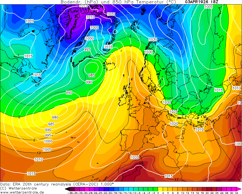 Réanalyse des masses d'air le 3 avril 1926 - via wetterzentrale.de