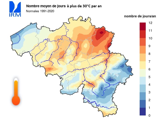 Nombre moyen de jours à plus de 30°C par an en Belgique (normales 1991-2020) - carte IRM