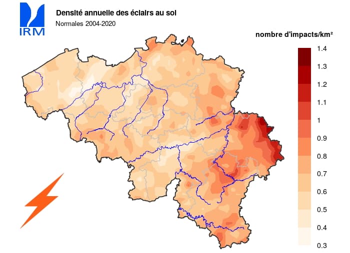 Si les orages sont moins fréquents à l'ouest que dans le centre de la Belgique, leur intensité est plus homogène. Le nombre moyen d'impacts de foudre au kilomètre carré varie en moyenne de 0,4 à 0,8 sur les deux tiers de la Belgique. Cependant, on note une activité foudroyante plus importante dans l'est du pays et notamment sur les hauteurs puisque la moyenne grimpe jusqu'à 1,4 éclair par kilomètre carré dans les Hautes Fagnes.
