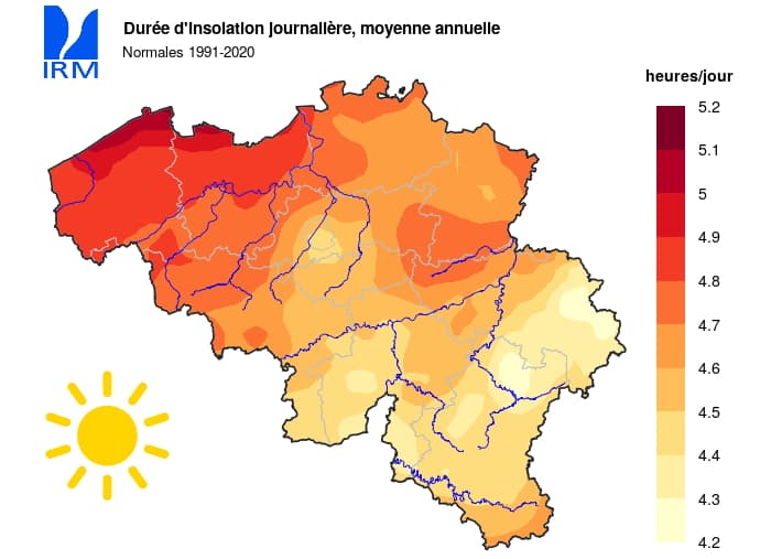 Durée moyenne d'ensoleillement journalier en Belgique au cours de l'année (normales 1991-2020) - carte IRM