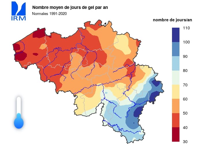 Nombre moyen de jours de gel par an en Belgique (normales 1991-2020) - carte IRM