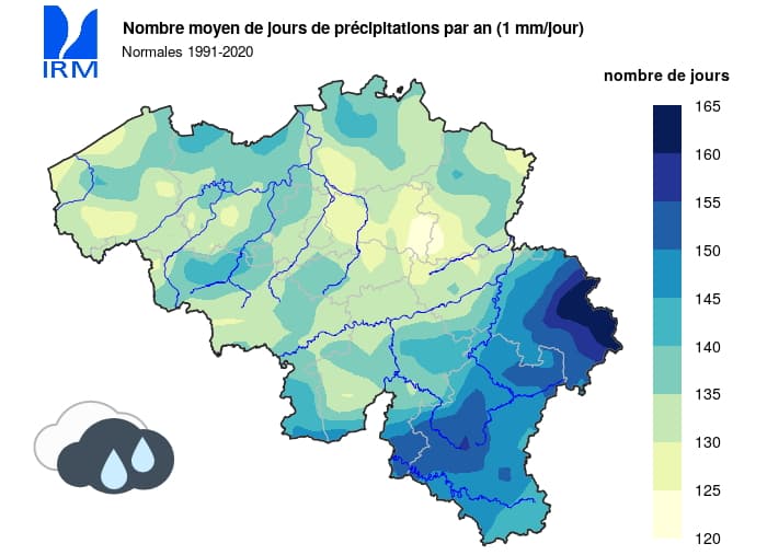 Nombre annuel moyen de jours avec au moins 1 mm de pluie en Belgique (normales 1991-2020) - carte IRM
