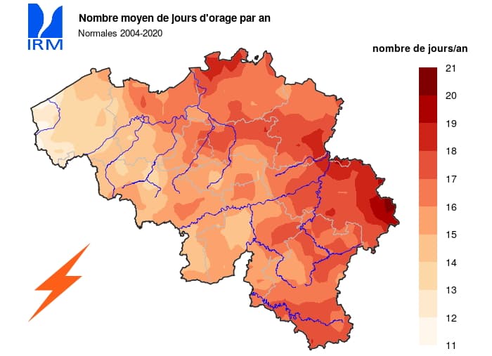 Nombre moyen de jours d'orage par an en Belgique (normales 2004-2020) - carte IRM