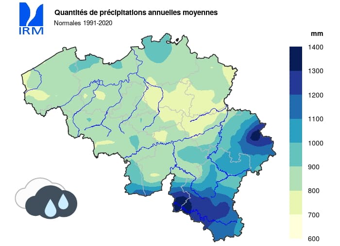 Quantités précipitations annuelles moyennes en Belgique (normales 1991-2020) - carte IRM