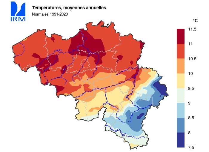 Sur une bonne moitié nord de la Belgique, les températures sont très proches de celles observées dans le Nord-Pas-de-Calais avec une moyenne annuelle de l'ordre de 10,5°C à 11,5°C. À titre de comparaison, la moyenne annuelle de Lille est de 11,3°C sur la période 1991-2020. Les valeurs sont plus basses sur les hauteurs du sud et de l'est du pays avec en moyenne 9,5 à 10,5°C vers 300 mètres d'altitude. Sur les points les plus hauts, elle se situe plutôt entre 8 et 9°C (même un peu sous les 8°C vers les sommets des Hautes Fagnes).