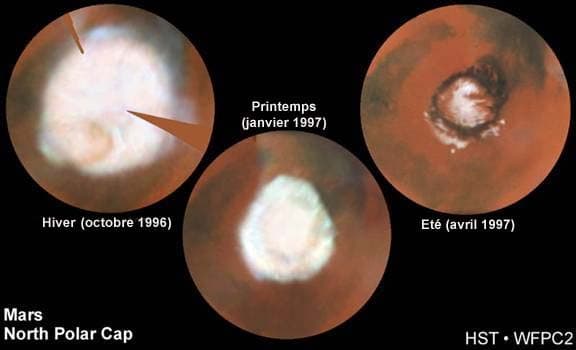 En moyenne, la température au pôle Nord de Mars est de -120°C l'hiver et -50°C l'été. Au pôle Sud, elle est de -130°C l'hiver et -100°C l'été. C'est donc en toute logique que la superficie des calottes glaciaires de la planète rouge évolue au cours de l'année. Dans l'hémisphère nord, la glace s'étend jusqu'à 60°N à la fin de l'hiver. Elle n'est plus présente qu'à partir de 70°N trois mois plus tard tandis qu'à l'été, elle ne forme plus qu'un simple anneau au niveau du pôle. Notons que la calotte du pôle sud est plus importante (car les températures y sont plus basses en raison de l'inclinaison de l'axe de rotation de la planète qui est de 25°).