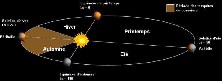 Ainsi, dans l'hémisphère nord de Mars, le printemps dure 194 jours tandis que l'automne ne dure que 143 jours. L'été, quant à lui, dure 178 jours et l'hiver 154 jours. Dans l'hémisphère sud, les saisons sont inversées. L'hémisphère nord martien connaît un hiver court et "doux" alors qu'il est long et froid dans l'hémisphère sud - où l'été est plus court mais plus chaud que dans l'hémisphère nord.