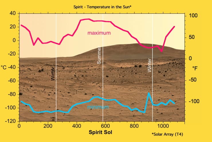 Le graphique ci-dessus montre les mesures de températures réalisées par un rover de la NASA à proximité de l'équateur de Mars entre 2004 et 2007. En plein été, il peut faire moins de -80°C la nuit et plus de +20°C le jour ! Durant l'hiver, la température peut descendre sous les -100°C la nuit et reste négative en journée.