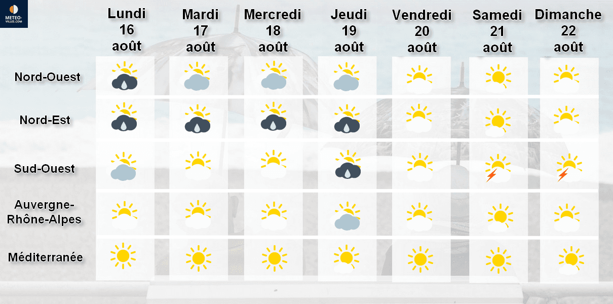 Ressenti prévu pour la semaine du 16 au 22 août 2021 sur 5 régions françaises - Météo-Villes