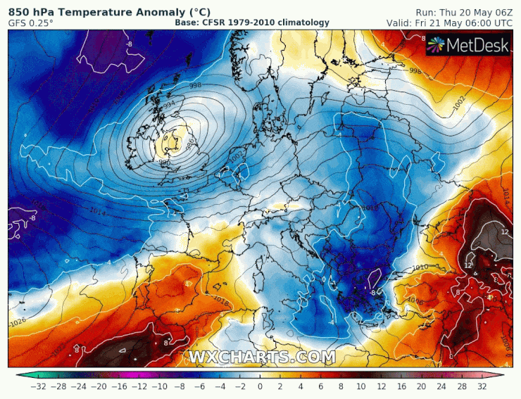 Même si ce jeudi 20 mai 2021 fut plus sec en France, le mauvais temps ne s'est pas éloigné très loin. Une dépression très creuse pour une fin de printemps circule actuellement sur l'Irlande avec une pression proche de 980 hPa en son centre. Celle-ci génère des vents parfois tempétueux sur les Îles Britanniques et va se décaler en direction de l'Angleterre puis de la Mer du Nord ce vendredi 21 mai.