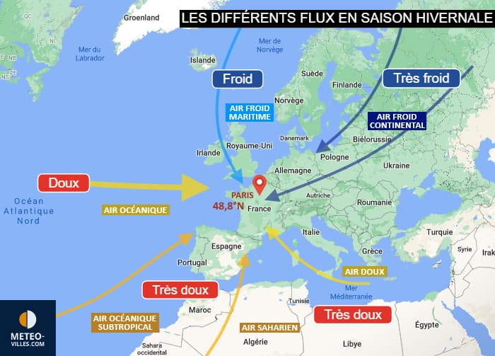 Schéma des flux en Europe durant la saison hivernale - Météo Villes (fond Google Maps)