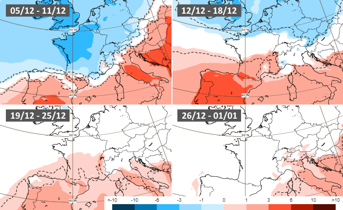 La période la plus froide du mois devrait se dérouler au cours de la fin de cette semaine avec des valeurs hivernales se généralisant. Au cours de la semaine prochaine (du 12 au 18 décembre 2022), le modèle européen envisage un contraste thermique avec un froid persistant au nord mais un redoux au sud. La dernière décade du mois serait ensuite proche des normales, voire un peu plus douces dans le sud de la France. Avec un tel scénario, le mois de décembre 2022 serait plus froid que la normale au nord et plus classique en allant vers le sud.