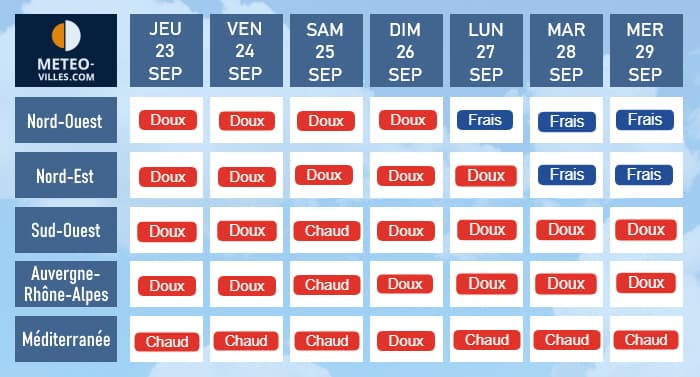 Prévisions des températures sur 5 zones françaises du jeudi 23 au mercredi 29 septembre 2021 - Météo Villes