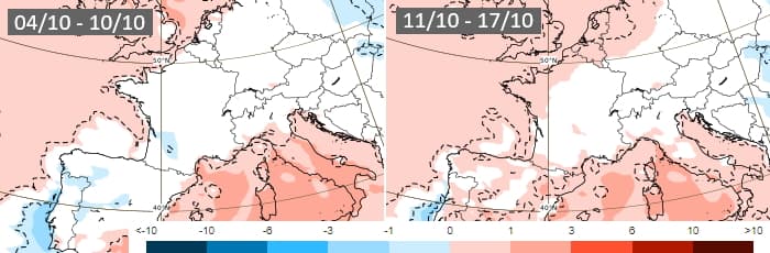 Le modèle américain modélise un temps plus doux que la normale pour la semaine du 4 au 10 octobre, suivi d'une semaine plus fraîche et tout juste dans les normales du 11 au 17 octobre. Le modèle européen, quant à lui, ne modélise pas d'anomalie particulière et s'attend donc à des températures proches des normales sur les deux semaines.