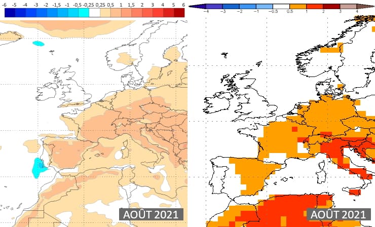 Écart thermique à la normale en août 2021 par le modèle européen (à gauche) et américain (à droite) - via ECMWF & NOAA