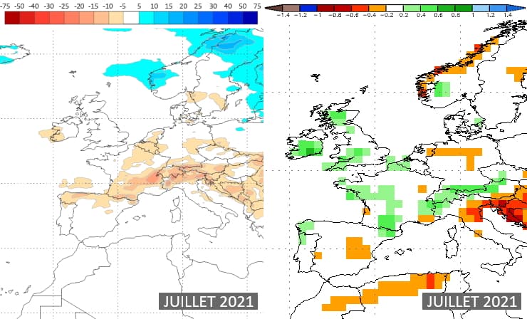 Écart pluviométrique à la normale en juillet 2021 par le modèle européen (à gauche) et américain (à droite) - via ECMWF & NOAA