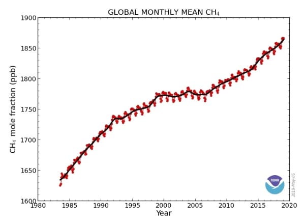 Concentration de méthane dans l'atmosphère depuis 1980 (en ppb) - via NOAA