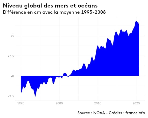 Évolution du niveau global des mers et des océans depuis 1990 - via France Info
