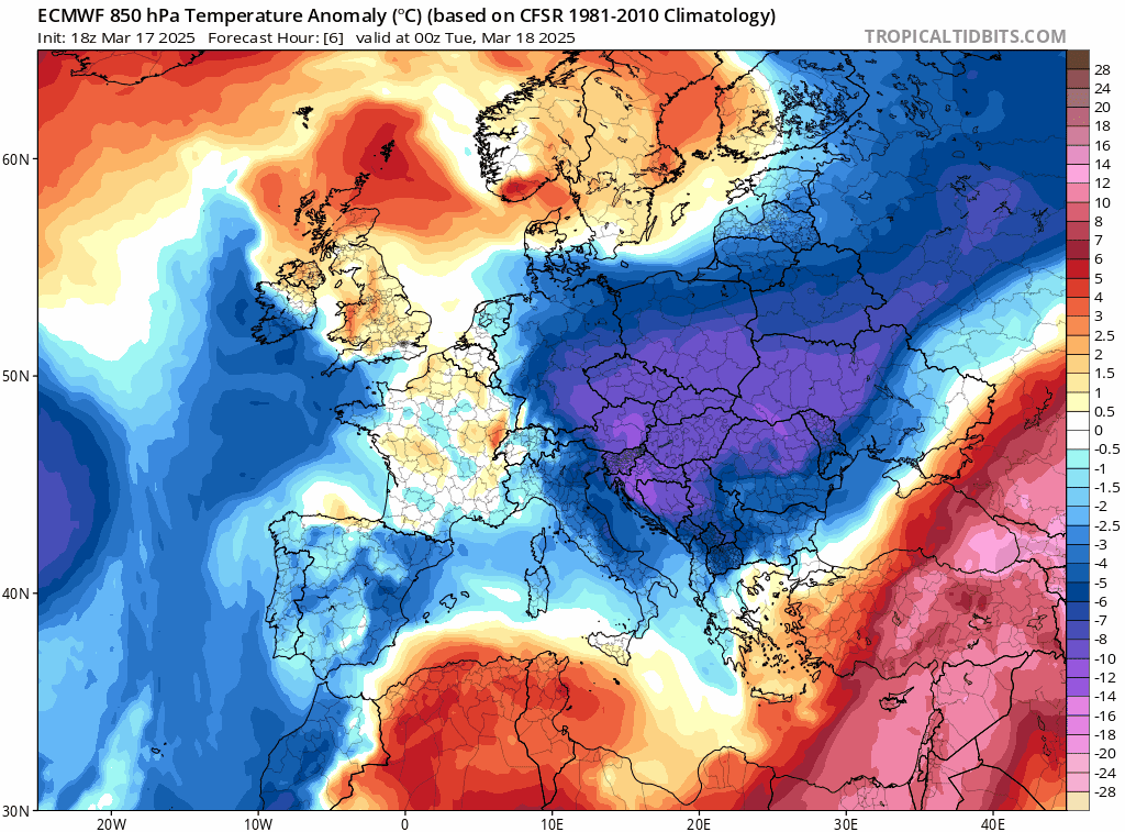 Écart à la normale de la masse d'air vers 1500m du mardi 18 au vendredi 21 mars 2025 - tropicaltidbits.com