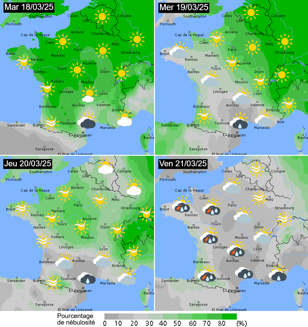 Pourcentage de couverture nuageuse prévu du mardi 18 au vendredi 21 mars 2025 - wofrance.fr