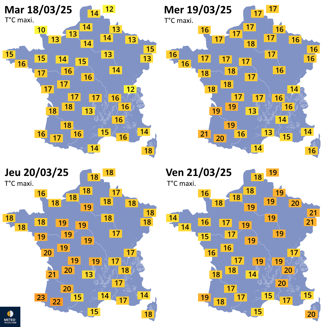 Températures maximales prévues du mardi 18 au vendredi 21 mars 2025 - Météo Villes