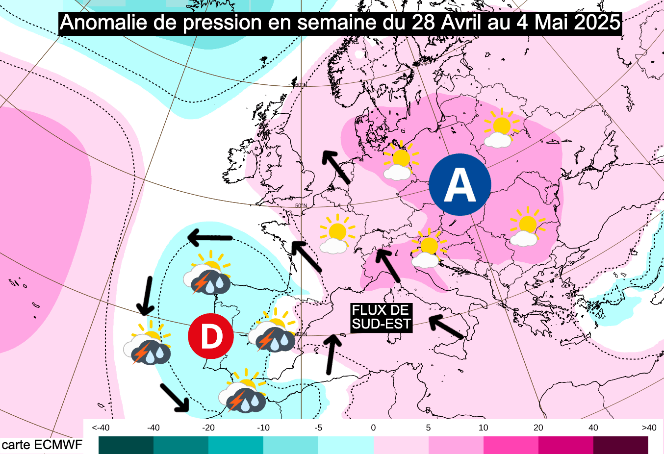 Anomalie de pression en semaine du lundi 28 avril au dimanche 4 mai 2025 - ECMWF
