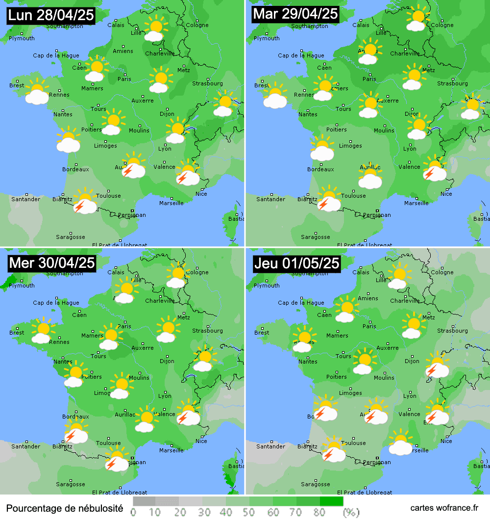 Pourcentage de nébulosité envisagé du lundi 28 avril au jeudi 1er mai 2025 - wofrance.fr