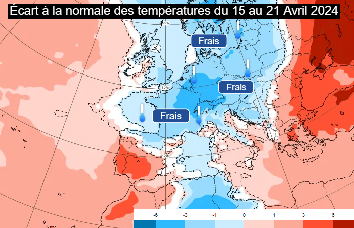Exit la chaleur précoce ! La France a renoué avec des températures sensiblement plus fraîches, sous l'effet d'un flux de nord-ouest. Il advecte un air venu du nord de l'Atlantique et fait plafonner le thermomètre plusieurs degrés sous les normales saisonnières. Cette semaine du 15 au 21 avril 2024 affichera un déficit thermique de 1 à 3°C dans le sud et l'ouest de la France et de 3 à 4°C dans le quart nord-est, où la fraîcheur sera la plus marquée. Cet épisode frais intervient après une première quinzaine d'avril remarquablement chaude (+3,5°C en France).